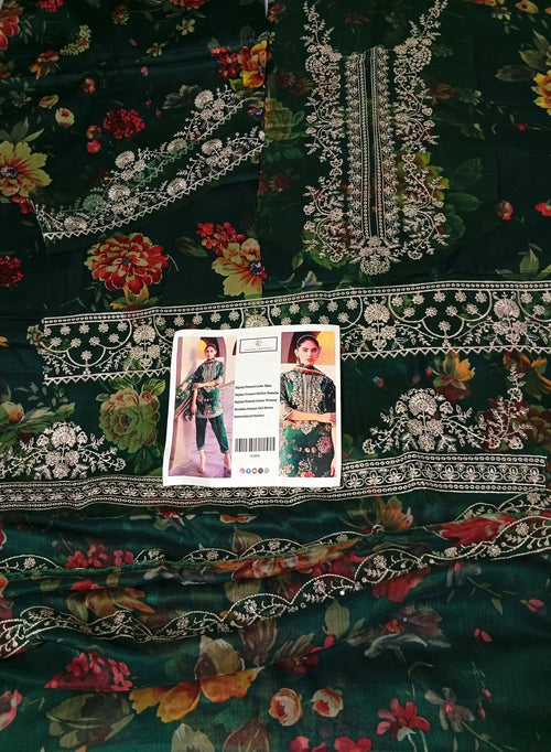 EXCEPTIONAL RICH BLACK + LACOSTE GREEN COLOUR LAWN CHUNARI WITH ORGANZA EMBROIDERY PATCHES AND EMBROIDERED READY TO WEAR DUPATTA